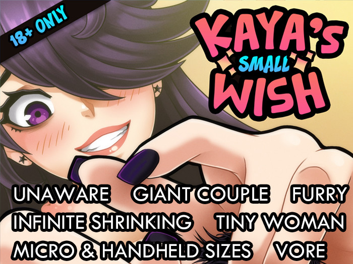 Kaya is tired of being the "tall girl" and wishes to be smaller than her roommate Rumi. Unfortunately wishes sometimes have drawbacks, especially when they're granted by a mischievous fox spirit! Now, continuously shrinking, Kaya can't deny the Kitsune his needs, nor can she seem to get her roommates attention, leading to her stuck in a very intimate moment between an unaware Rumi and her boyfriend.